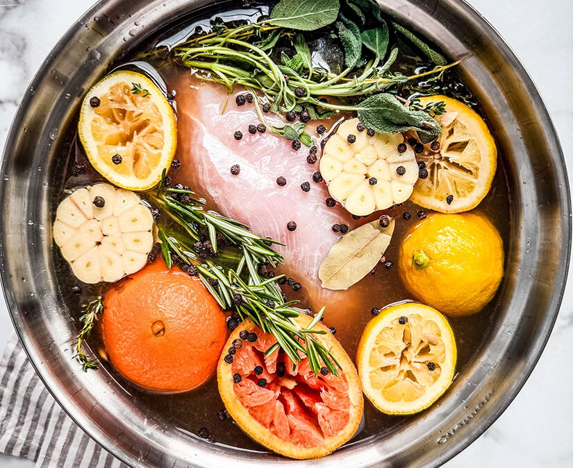 - Pour the cooled brine to your brining container. Add the rest of the cider along with the garlic cloves, herbs, and peppercorns. Squeeze the juice from the oranges and lemons into the pot (don’t worry about the pits) and place the squeezed orange and lemon into the pot as well. Slowly and carefully submerge the turkey into the brine (careful, the liquid level will rise). Cover and refrigerate for an hour per pound.